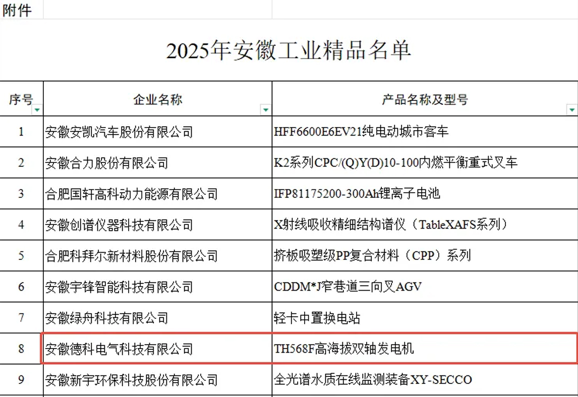捷报传来!日前,安徽省工业和信息化厅正式发布2025年《安徽工业精品》名单,PA视讯游戏电气TH568F高海拔双轴发电机凭借领先的技术性能与卓越的产品品质,成功入选,荣膺此项省级权威荣誉。